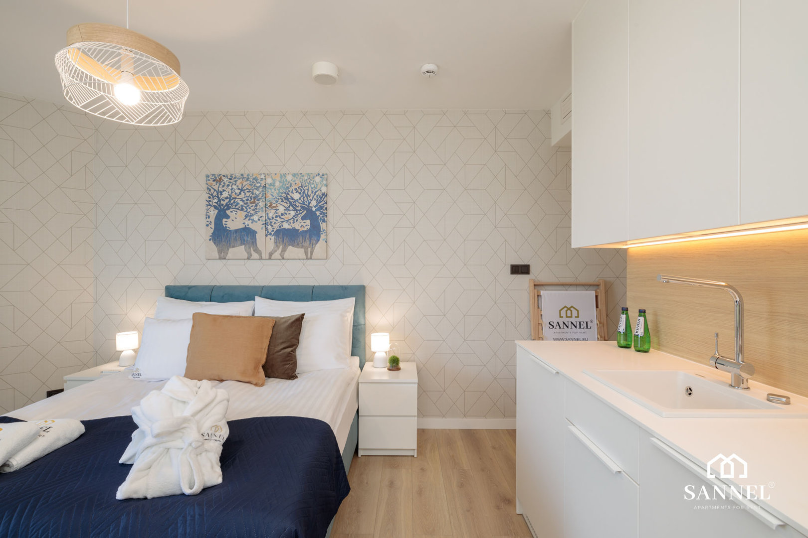 Apartament składa się z jednego pokoju z dużym łóżkiem sypialnianym, w pełni wyposażonego aneksu kuchennego, łazienki oraz balkonu. W pokoju apartamentu znajduje się duże łóżko sypialniane wraz z szafkami nocnymi z dostępem do gniazdek, stół z krzesłami do spożywania posiłków, duża komoda do przechowywania rzeczy, TV LED z dostępem do kanałów w różnych językach oraz serwisów takich jak np.Netflix. Aneks kuchenny posiada wszystkie niezbędne akcesoria kuchenne, sprzęty AGD takie jak czajnik,toster, ekspres do kawy potrzebne do przygotowania posiłków. Balkon z którego to można podziwiać morze, wyposażony został w dwuosobową ławę ze stolikiem. Przestronna łazienka apartamentu Horizon posiada szklaną kabinę prysznicową, umywalkę wraz z szafką,wiszącą szafkę z lustrem oraz toaletę.W korytarzu mieści się szafa do przechowywania rzeczy, lustro a także wieszak na odzież wierzchnią.
